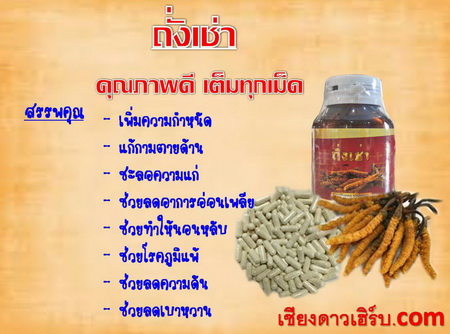 มีหลายท่านถามผมว่า สมัยนี้ ถั่งเช่ามีหลายรูปแบบ โดยที่ผู้ซื้อไม่อาจทราบได้ว่าสิ่งที่บรรจุในแคปซูลนั้น ประกอบไปด้วยอะไรบ้าง มีคนมาบ่นให้ได้ยินอยู่บ่อยๆ ว่า ทานแล้วไม่ได้ผลและได้โทรปรึกษาสอบถามมายังเจ้าหน้าที่ฝ่ายขายของเราว่า ถ้าจะซื้ออาหารเสริมเห็ดถั่งเช่า ควรซื้อยี่ห้อไหนจะดีที่สุด เราขอแนะนำอาหารเสริมถั่งเช่าที่ดีที่สุดควรเป็นถั่งเช่าที่ผลิตจากถั่งเช่าแท้100% และผ่านกระบวนการผลิตที่ได้มาตรฐานGMP ถ้าท่านยังหาอาหารเสริมถั่งเช่าเพื่อมาบำรุงร่างกายของท่านไม่ได้ ขอแนะนำอาหารเสริมถั่งเช่าทิเบตแคปซูล เชียงดาวเฮิร์บ ท่านจะได้สินค้าราคาส่งเพราะเป็นสินค้าที่ผลิตจากโรงงานของเราเอง